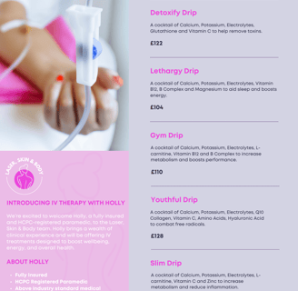 Our IV Drip Therapy is a powerful way to boost hydration, energy levels, and overall wellness by delivering essential vitamins, minerals, and nutrients directly into the bloodstream. Whether you're looking to support your immune system, improve skin health, recover after a busy week, or simply give your body a boost, our bespoke IV infusions are tailored to your individual needs.